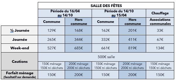 Sa capacité d'accueil est de 300 personnes assises, tables et chaises sont à disposition comprises dans la location.